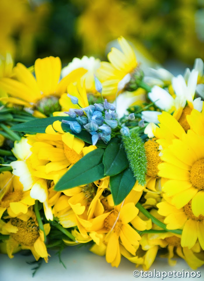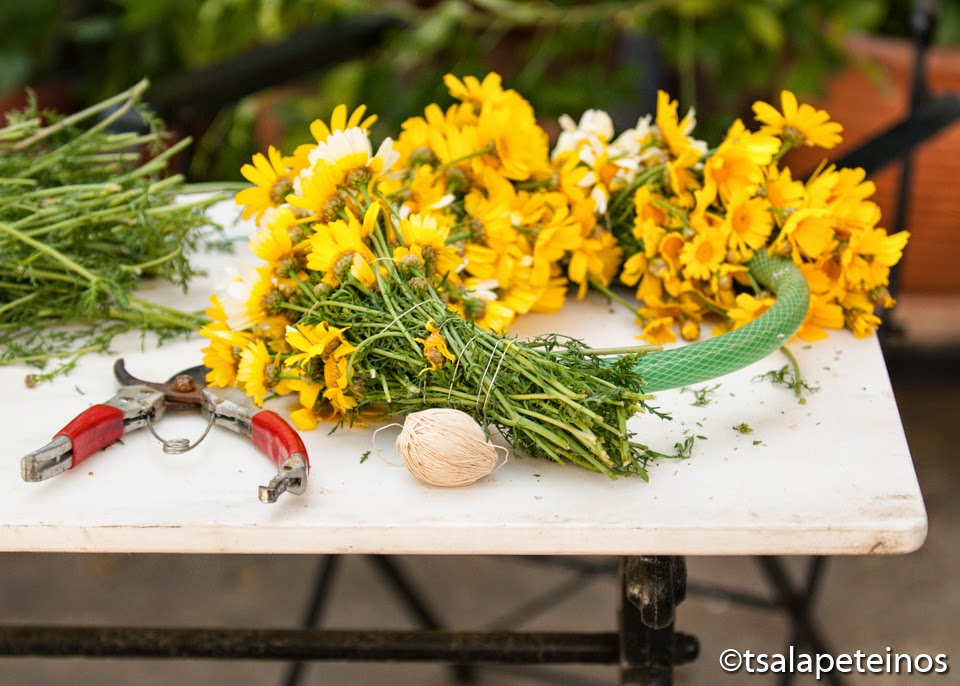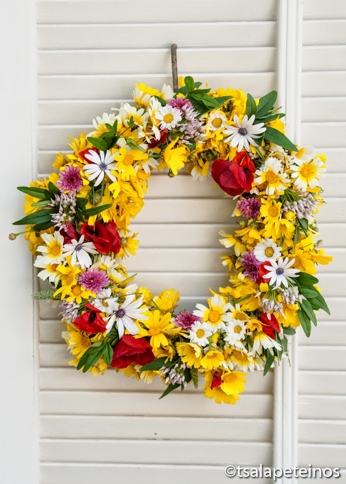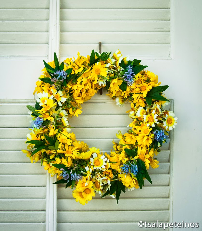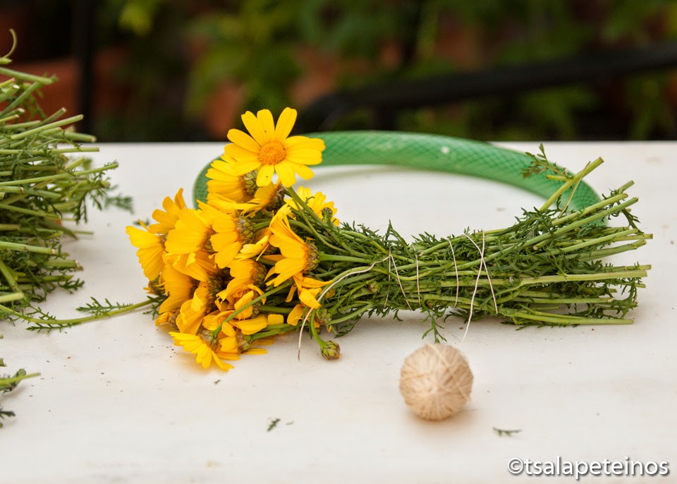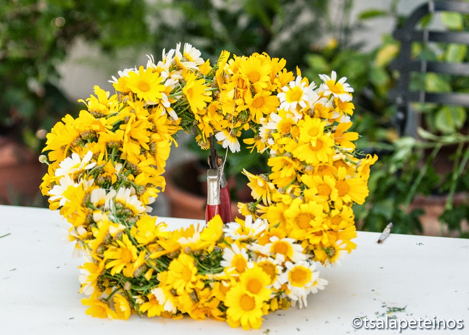 Εναλλάσσοντας τα ματσάκια με τις κίτρινες και άσπρες μαργαρίτες, που συνήθως αποτελούν τα βασικά λουλούδια για το μαγιάτικο στεφάνι, καλύπτουμε όλη τη βάση.