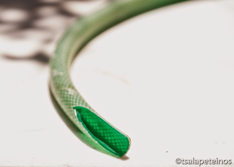 Αν βρούμε λεπτά και εύκαμπτα κλαδιά σε μεγάλο μήκος, πλέκοντάς τα σχηματίζουμε τη βάση. Αν όχι, κόβουμε λάστιχο ποτίσματος* σε μήκος ανάλογο με το μέγεθος που θέλουμε να είναι το στεφάνι μας και χαράζουμε την μια άκρη, όπως στην εικόνα.